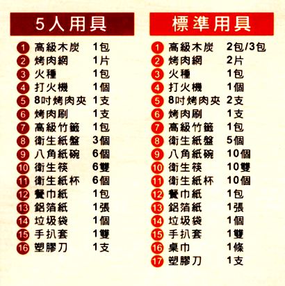 1. 烤肉用具、配料依照實品數量配置。以下部分食材不包含飲料!