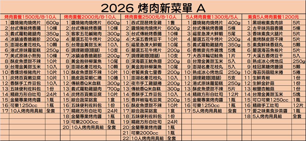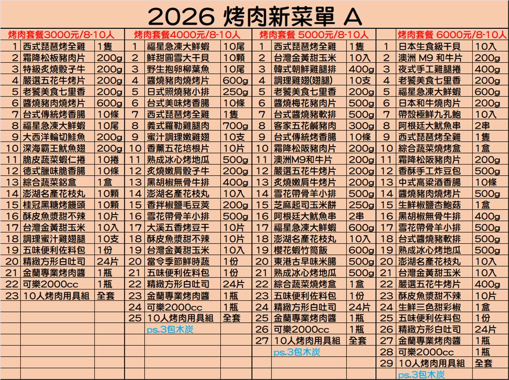 1. 烤肉用具、配料依照實品數量配置。以下部分食材不包含飲料!